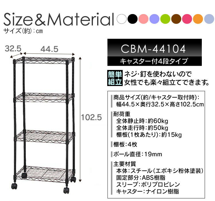 ●商品サイズ(約):幅44.5×奥行32.5×高さ102.5cm(キャスター取付時)●商品重量(約):4.0kg●稼働棚板:4枚●ポール径:1.9cm●耐荷重(約) 全体 静止時:60.0kg 走行時:50.0kg 棚板(1枚当たり):15.0kg●材質 棚板・ポール:スチール(粉体塗装) 固定部品:ABS樹脂 スリーブ:ポリプロピレン キャスター:ナイロン樹脂◇◆おススメ商品◆◇★
